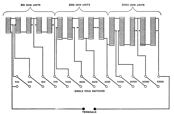 Ratio arms and a rheostat box having a maximum resistance of 100,000 ohms complete the apparatus necessary to make the tests on the cells. A laboratory set with this range is rather expensive and since our measurements need not be extremely accurate a good resistance box may be made from resistance units as used for motor starting and signal work. These units consist of an iron tube covered with asbestos on which is wrapped the resistance wire, the wire in turn being covered with a vitreous insulating material baked in place. These units can be purchased quite reasonable from any large electrical supply house in any resistance up to 150,000 ohms. For our purpose 15 units will be required, five, 200 ohm; five, 2000 ohm and five, 20,000 ohm; all tapped at the center, for the rheostat arm. For the ratio arms a single 1000 ohm unit tapped at the center is used. The rheostat arm units should be mounted in a box and heavy leads run to 12 single pole switches mounted on the top of the box. The method of wiring the resistances is shown in Fig. 15, the switches being marked so the resistance in the circuit can be quickly determined. With this arrangement any resistance from 100 to 111,000 ohms can be obtained in steps of 100 ohms by opening the proper switches. [Pg 38]