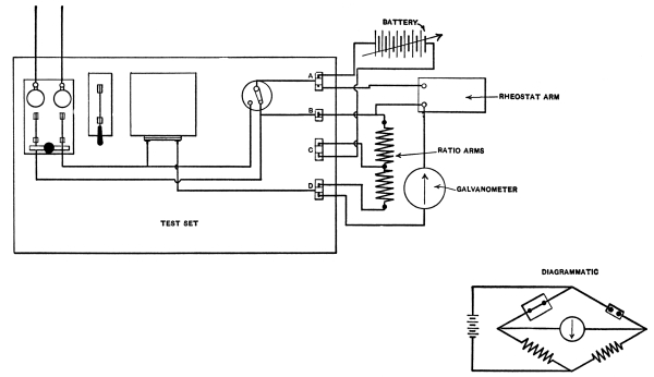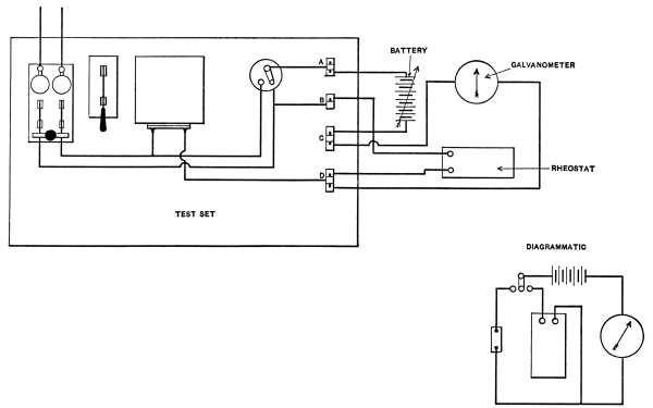 As previously mentioned the testing set may be used for measuring the resistance of the cells by the substitution method. The apparatus is connected as shown in Fig. 17 when so used, a diagrammatic circuit being given in the insert. When the battery switch is on the left hand point the cell is in series with the battery and galvonometer. When the switch is moved to the right hand point the rheostat is in series with the battery and galvonometer. The method of measuring is to first determine the galvonometer deflection with the cell in the circuit and then by switching the rheostat into the circuit and adjusting it so the galvonometer gives the same deflection enabling the resistance of the cell to be read directly. The same series of tests should be gone through with this method as with the bridge circuit. [Pg 47]
