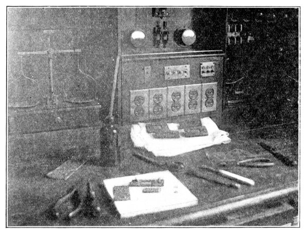 [Pg 36] At the extreme left of the base a double pole fuse switch is mounted to control the alternating current to treat the cell. Instead of fuses two tubular incandescent lamps are screwed into the receptacles on the switch to limit the A. C. to a value that will not endanger the cell by overheating it. Should lighting current not be available use can be made of a buzzer and telephone induction coil connected to a dry cell as shown in Fig. 14 to furnish current for treating the cell.