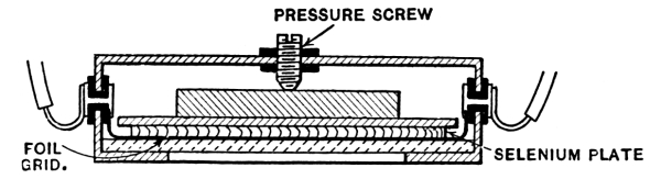 The selenium is not applied to the grid in the molten state. A thin plate of metallic selenium is obtained by melting the metal on a glass plate and then applying pressure with a cold glass plate. After annealing the selenium will be found to adhere closely to the hot plate in a thin film. The cell is then assembled by placing the plate with the gold grid in a frame having a portion of one side cut out to form a [Pg 16] window. The plate with the selenium adhering is placed over the grid and forced into contact with same by means of a small screw.