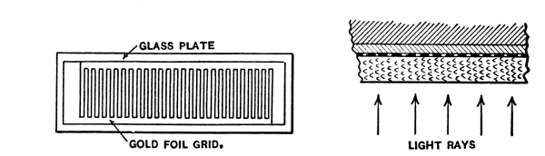 We come now to the consideration of cells wherein the current flows at right angles to the surface of the selenium. This implies the use of at least one electrode on the surface of the selenium. The Gripenberg cell has both electrodes on the surface. As shown in Fig. 5 the electrodes are made by depositing a thin film of gold on a glass plate and with a [Pg 15] sharp tool removing narrow strips of it to form a grid, alternate bars of which are connected to the same terminal. The grid arrangement is shown in the detail illustration.
