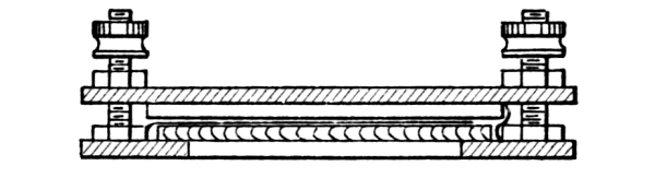 Lay the tinned copper plate on the table, tinned side up and place the template over it. With the palette knife place a small quantity of the selenium on the plate and smooth it out into an even layer ¹/₃₂ of an inch thick. Remove the template carefully so as not to disturb the selenium and lay the plate on one end of the iron block having the thermometer well in it. Cover the selenium with a sheet of mica and lay another smooth block ¼ inch thick on top of the mica sheet. The whole is conveyed to the hot press and placed in the center of the slate slab, the lever being let down into place with the saddle centering over the cell.