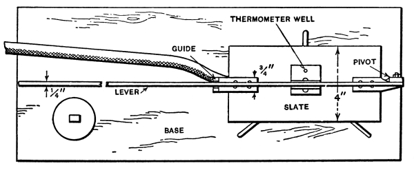 The temperature as indicated by the thermometer will rise slowly due to the bulk of the slate to be heated. At 150° C the selenium will soften and the lever settle slightly. Continue the heating till the temperature reaches 220° C and then remove the bunsen burner.