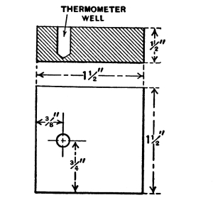 The cell while undergoing treatment rests on a small iron block, the [Pg 25] details of which are given in Fig. 9. The block is 1½ inches square and ½ inch thick. A hole is drilled at one side to take the bulb of a chemical thermometer. This block serves two purposes, it allows of accurate determination of the cell temperature and simplifies the assembly of the cell for treatment. The thermometer should have a range up to 220° C.