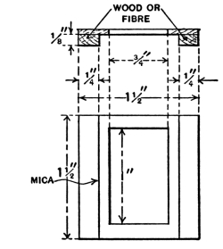 This completes the hot press proper. In addition will be required a 2 or 4 oz. mortar and pestle to powder the selenium, a pair of tweezers, a small palette knife and a template for applying the selenium to the copper plate. The latter is made from a sheet of mica or thin cardboard with rectangular hole cut in the center as shown in Fig. 9. This sheet is glued to two small strips of wood or fibre. The template just fits over the copper plates and confines the selenium powder to the center of the plate.