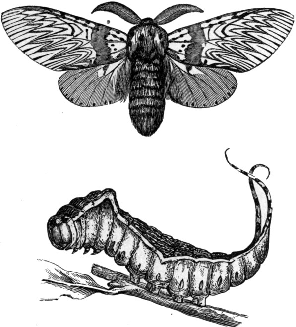 87. The caterpillars of the Goat moth feed in poplar, willow, elm, oak, lime, and beech, as well as in apple, pear, walnut, and other trees. (E. A. O.)