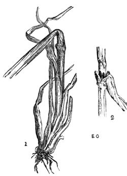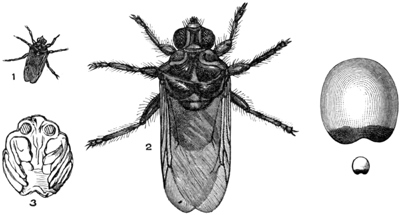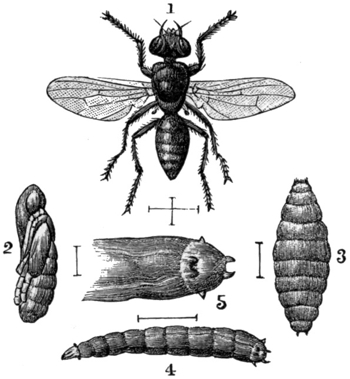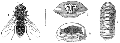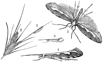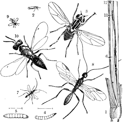 61. 132The attack is caused by the small black and yellow fly, figured above. She lays an egg on the barley sheath; the maggot from this attacks the ear, then eats a channel down one side of the stem to the first knot, and then turns to chrysalis state within the leaves.—(E. A. O.)
