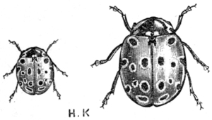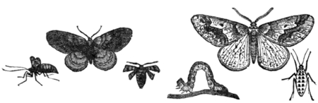 28. To such of my readers as possess some portion only of the early series, it may be of interest to point out that the observations, up to those for 1880 inclusive, were arranged, not as afterwards, as detached papers, placed alphabetically under the heading of the names of the crops to which they referred, but under the numbers given in the successive preceding guide lists issued for the use of observers—as for instance, “6, Anthomyia ceparum, Onion fly;” or “25, Abraxas grossulariata, Magpie moth” (fig. 9).