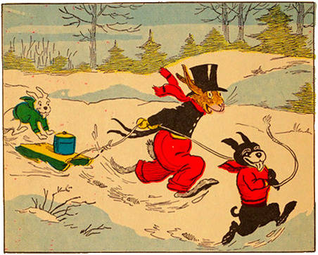 6. On and on raced Uncle Wiggily, helping Peetie pull the sled, while Jackie sat on it holding the pudding. “Why shouldn’t we be afraid, Uncle Wiggily?” asked Jackie. “How can you save us?” The Bob Cat caught up to them and took the cover off the pudding pail. Out popped the hot steam. “Oh, wow! I’m burned!” howled the Bob Cat. “Just what I thought would happen!” said Uncle Wiggily.
