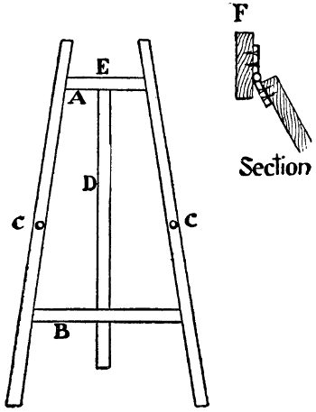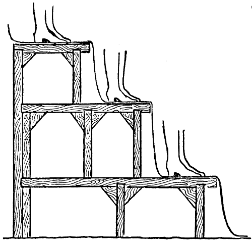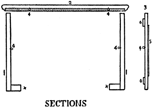 The stage can be constructed in the following simple manner:—Hire a number of ordinary benches or stout boxes of equal dimensions, and on these superimpose lengths of scaffold-boarding or planks. These latter should be of equal thickness throughout, in order that a perfectly level staging may be obtained. The whole may be made quite secure by the judicious use of nails, although care should be taken that no damage is done to the benches, or this will have to be paid for when they are returned. A floor covering of felt or linoleum will also prove serviceable.