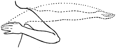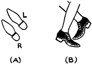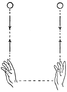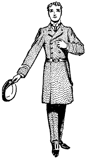 1st. The right hand is raised to the shoulder, and then passed slowly down across the body to the left knee.