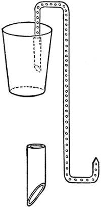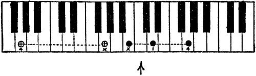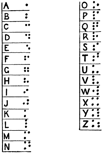As a matter of interest as well as of use, the blind alphabet of the Braille system is shown in Fig. 9, and by this means letters and notes can be written, which will be perfectly intelligible to a blind person. In pricking the characters through a paper, it should be remembered that the points must be reversed, and the letters begun from right to left, as the blind person will read from the other side, where the pin-pricked holes will have raised little points of paper.