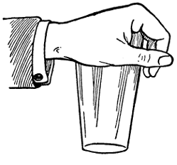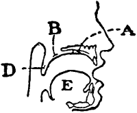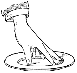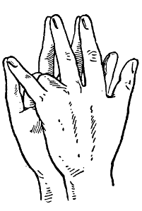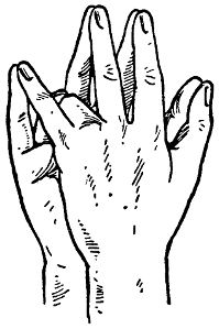 3rd. The right hand is clasped, the thumb and little finger extended. The former is placed against the lips, whilst the latter touches the breast.