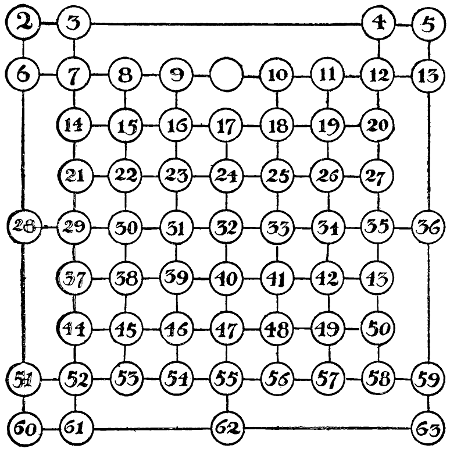The board should be prepared as in the case of checkers, with the exception that points should be made from the back, in the manner described in connection with the Halma board.