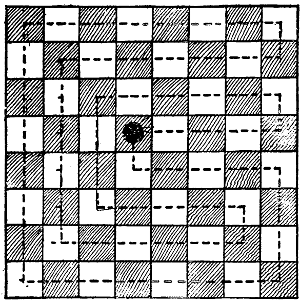 In the center of each square a nail should be driven from the back of the board, with the end cut off and point filed to smoothness. These nails should project from the face of the board about half an inch. The ordinary Halma men have a hole on the under side, which enables you to place them upon the upraised points, where they will be held firmly.