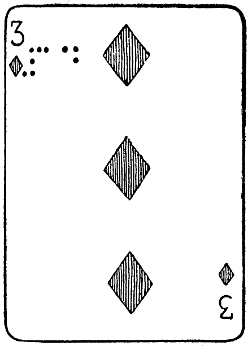 By means of a large pin, the designation and value of a card can be pricked on the back, so that the upraised holes are perceptible to touch. These values and denominations should be pricked in the[539] corner where the small designation of the value of a card is always to be found, as in Fig. 1.