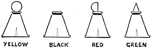 It will now be necessary to make some alteration in the men, to distinguish the colors. In Fig. 7 an idea of how this may be done is given. The Yellow men are left untouched, Black have their heads cut right off, Red have one half of the head cut away, while the Green have the head sharpened to a point.