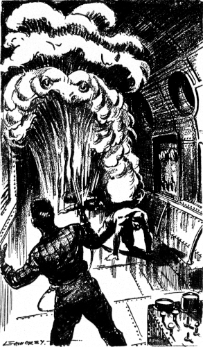 Cargyle, the second officer, charged by a yelling, wild-eyed mob of crazy murderers, fought them coldly, shooting with deadly precision. His slow retreat brought him to the little cabin, where his position was almost impregnable, and which he knew connected through the secret passage with the control cabin.