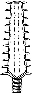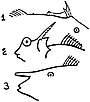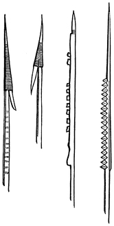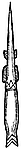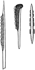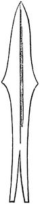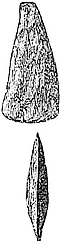 The pugnacious and voracious little ‘stickleback’ (Gasterosteus) is similarly provided. The ‘bull-head’ (Cottus diceraus, Pallas[32]) bears a multibarbed horn on its dorsum, exactly resembling the spears of the Eskimos and the savages of South America and Australia. The yellow-bellied ‘surgeon’ or lancet-fish (Acanthurus) is armed, in either ocean, with a long spine on each side of the tail; with this lance it defends itself dexterously against its many enemies. The Naseus fronticornis (Lacépède) bears, besides the horn-muzzle, trenchant spear-formed blades in the 11pointed and serrated tail. The sting-fish or adder-pike (Trachinus vipera) has necessitated amputation of the wounded limb: the dorsals, as well as the opercular spines, have deep double grooves in which the venomous mucous secretion is lodged—a hint to dagger-makers. The sting-rays (Raia trygon and R. histrix[33]) twist the long slender tail round the object of attack and cut the surface with the strong notched and spiny edge, inflicting a wound not easily healed. The sting, besides being poisonous, has the especial merit of breaking off in the wound: it is extensively used by the savages of the Fiji, the Gambier, and the Pellew Islands, of Tahiti, Samoa, and many of the Low Islands.[34] These properties would suggest poisoned weapons which cannot be extracted. Such are the arrows of the Bushman, the Shoshoni, and the Macoinchi of Guiana, culminating in the highly-civilised stiletto of hollow glass.