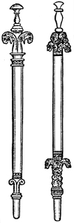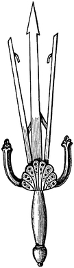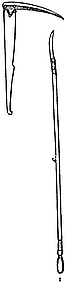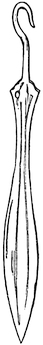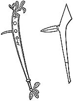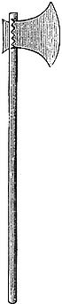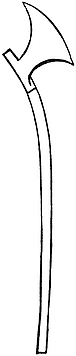 The other German blade was single-edged and curved: it was a semi-Spatha, half the size of the Spatha, and it hung to the warrior’s right side. This weapon was probably the Sahs,[996] Seax, Sax, the favourite of the Saxons; also called Breitsachs and Knief (knife), and at later times, scramasaxus, Scramasax.[997] A large iron knife, with a yataghan curve, it was used 273either as a dirk or a missile. Some of these throw-Swords had a hook by way of pommel for better securing the hilt. The Schwertstab (Sword-staff) or Prachtaxt is described and figured by Jähns[998] as a kind of dolch[999] or dagger, attached to a long hollow metal haft, like that of a Persian war-axe. It is a rare article, and its rarity leads him to believe it was symbolic of the Saxnot (Sword-god) Zio, Tui, or Tuisco. Dr. Evans[1000] considers the weapon ‘a kind of halberd or battle-axe;’ others, a commander’s staff or bâton of honour; but the article is too widely used to be so explained. A fine specimen of the Schwertstab with handle and blade of bronze, was found at Årup in Scania, and an analogous form is shown in a Chinese blade.