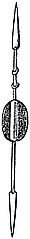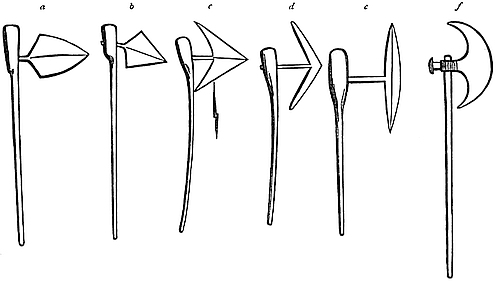 We have the authority of Tacitus for the fact that the Germans of his day did not (like the Kelts)[981] affect the short straight sword: ‘rari ... gladiis utuntur.’[982] The national weapon was the spear[983] of a peculiar kind; ‘hastas vel ipsorum vocabulo frameas gerunt angusto et brevi ferro.’ The derivation of the word and the nature of the weapon are still undetermined.[984] Modern authorities hold the oldest framée to have been a long spear, with a head of stone, copper, bronze, or iron, shaped like a Palstab or an expanding ‘Celt;’ and Demmin[985] shows the same broad shovel-shaped base in the Abyssinian lance. It was either thrown or thrust, and the weapon must not be confounded with the enormous hastæ of 271Tacitus,[986] in whose day the Roman spear was fourteen feet long. It was a formidable weapon; those who knew it spoke with awe of ‘illam cruentam victricemque frameam’; and the Germans long preserved the saying ‘one spear is worth two Swords.’ Yet, strange to say, it is rarely found in graves, where the throwing-axe of stone and bronze, pierced or unpierced, one-edged or two-headed (πέλεκυς ἀμφιστόμος, bipennis), is so common.