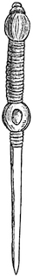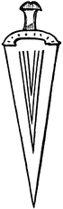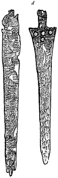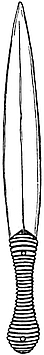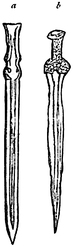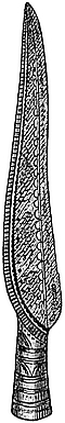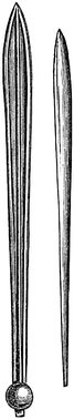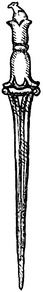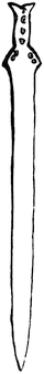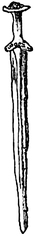 The bronze Swords of the ancient Britons are of two kinds: the leaf-blade and the Rapier, both well cast. The total length of the former is about two feet, the extremes being sixteen inches to thirty, and in rare cases more. The blades are uniformly rounded, but with the part next the edge slightly drawn down so as to form a shallow fluting. The breadth appears greatest at the third near the point, and this would add to the facility of unsheathing. In almost all cases they are strengthened by a rounded mid-rib more or less bold; or they show ridges, with and without beading, or parallel lines that run along the whole blade or the greater part near the edges. Some combine mid-rib and ridges. The shoulders are either 278plain, notched, or flanged. In rare instances the outer part of the hilt is of bronze: Dr. Evans engraves[1034] a specimen of this kind. The total length of the weapon is twenty-one inches, of which the globular pommel and the grip, made for a large hand, occupy five. The hilt has the appearance of being cast upon the blade: it seems to have been formed of bronze of the same character, and there are no rivets by which the two castings could be attached. The shallow crescent, whose hollow faces the mid-rib (fig. 293), is a characteristic feature, and endures for ages in the northern bronzes.