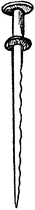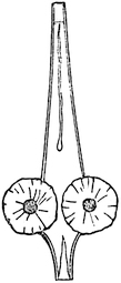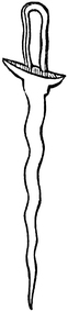 The handle of the leaf-blade usually consisted of plates of horn, bone, or wood, riveted on either side of the hilt plate. The latter differs considerably in form, and in the number and arrangement of the rivets, by which the covering material was attached. Some have as many as thirteen piercings; they seldom, however, exceed seven. The apertures are either round holes or longitudinal slots of greater or lesser extent. There is a pronounced swelling in the grip when the tang is of full length. At the end it expands, evidently for the purpose of receiving a pommel formed by the material of the hilt. This tang end is a fish-tail more or less pronounced. One illustrated by Dr. Evans[1035] has two spirals attached to the base of the hilt, a rare form in England, but common in Scandinavia. Another[1036] pommel-end has a distinct casting, ‘and is very remarkable on account of the two curved horns extending from it, which are somewhat trumpet-mouthed, with a projecting cone in the centre of each.’ This manilla-end appears to me Irish.