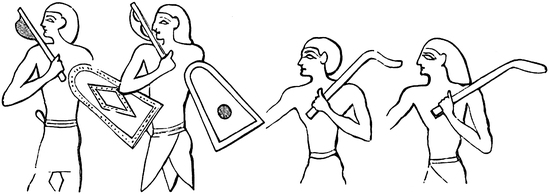 The lower animals are born armed, but not weaponed. The arm, indeed, is rather bestial than human: the weapon is, speaking generally, human, not bestial. Naturalists have doubted, and still doubt, whether in the so-called natural state the lower animals use weapons properly so termed. Colonel A. Lane Fox, a diligent student of primitive warfare, and a distinguished anthropologist,[6] distinctly holds the hand-stone to be the prehistoric weapon. He quotes (Cat. pp. 156–59) the ape using the hand-stone to crack nutshells; the gorillas defending themselves against the Carthaginians of Hanno; and Pedro de Cieza (Cieça) de Leon[7] telling us that ‘when the Spaniards [in Peru] pass under the trees where the monkeys are, these creatures break off branches and throw them down, making faces all the time.’ Even in the days of Strabo (xv. 1) it was asserted that Indian monkeys climb precipices, and roll down stones upon their pursuers—a favourite tactic with savages. Nor, indeed, is it hard to believe that the Simiads, whose quasi-human hand has prehensile powers, bombard their assailants with cocoa-nuts and other missiles. Major Denham (1821–24), a trustworthy traveller, when exploring about Lake Chad, says of the quadrumans of the Yeou country: ‘The monkeys, or, as the Arabs say, men enchanted (Beny Adam meshood),[8] were so numerous that I saw upwards of a hundred and fifty assembled at one place in the evening. They did not appear at all inclined to give up their ground, but, perched on the top of a bank some twenty feet high, made a terrible noise, and, rather gently than otherwise, pelted us as we approached within a certain distance.’ Herr Holub,[9] also, was ‘designedly aimed at by a herd of African 3baboons perched among the trees;’ and on another occasion he and his men had to beat an ignominious retreat from ‘our cousins.’ ‘Hence,’ suggests Colonel A. Lane Fox, ‘our “poor relation” conserves, even when bred abroad and in captivity, the habit of violently shaking the branch by jumping upon it with all its weight, in order that the detached fruit may fall upon the assailant’s head.’ In Egypt, as we see from the tomb-pictures, monkeys (baboons or cynocephali) were taught to assist in gathering fruit, and in acting as torch-bearers. While doing this last duty, their innate petulance caused many a merry scene.[10]