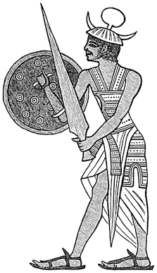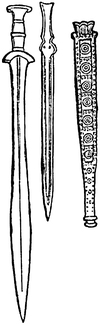 Plutarch[1006] describes the Cimbrian Sword as a large heavy knife-blade (μεγάλαις ἐχρώντο καὶ βαρείαις μαχαίραις), They had also battle-axes, and sharp, bright degans or daggers: the latter were highly prized, and their cuneiform shape caused them to be considered symbols of the deity,[1007] As usual amongst barbarians, the weapons of the chiefs had terrible names, so as to strike even the hearer with fear.[1008] Their defensive weapons were iron helmets, mail coats, and white glittering shields. Eccart holds that these arms and armour must have been taken from the foe: their barrows, in Holstein and elsewhere, having produced only stone-celts and spear-heads with a few copper Sword-blades, but no iron.