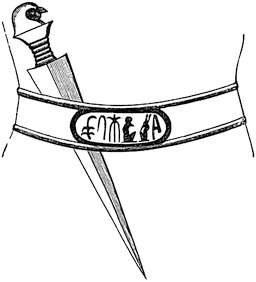 We have now assisted at the birth of the Sword in the shape of a bit of wood, charred and sharpened. We have seen its several stages of youth and growth to bone and stone, to copper and bronze, to iron and steel. When it had sufficiently developed itself Egypt gave it a name, SFET; and this name, at least fifty centuries old, still clings to it and will cling to it. In the hands of the old Nilotes the Sword spread culture and civilisation throughout adjoining Africa and Western Asia. The Phœnicians carried it wide and side over the world then known to man. The Greeks won with it their liberty and developed with it their citizenship. Wielded by the Romans, it enthroned the Reign of Law, and laid the foundation for the Brotherhood of Mankind. Thus, though it soaked earth with the blood of her sons, the Sword has ever been true to its mission—the Progress of Society.