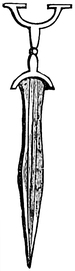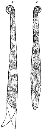 Iron, according to Tacitus,[987] was known to the Germans, but was not common. His statement is supported by ‘finds’ in the old tumuli and stone rings, known as Riesenmauer, Hünnenringe,[988] Teufelsgraben, Burgwälle, and others. The myths of giants, dwarfs, and serpents suggest an Eastern origin for the metal. Bronze blades, on the other hand, are common. A typical specimen from the Elbe valley in the Klemm collection is thus described by Jähns.[989] The whole weapon is 23·25 centimètres long, the blade being 18·5, with a maximum breadth of 1·625. The shape is conical, tapering to the point; a high and rounded mid-rib is subtended on either side by a deepened line which runs to the end. Between shoulders and blade the front view shows on either side a crescent-shaped notch. The grip is narrower at the middle, where there is a long oval slit for making fast the handle; and there are two rivet holes on either side of the shoulders, whence the mid-rib springs. It shows no pommel, the place being taken by a shallow crutch.