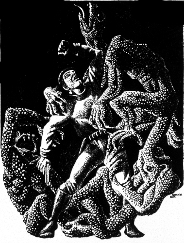 Bhak dropped them with a grunt. Swinging his great hands, forgetting his gun completely, he stood at bay. There was a rush of bodies in the rain-blurred dusk, a flash of scarlet eyes and triangular mouths laughing in queer, noseless faces. Then there were scaly, man-like things hurled like battering-rams against the Legionnaires.