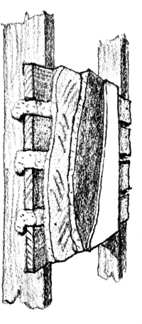 In building the old ledged doors, the planks were set vertically and held together with battens through which were driven wooden pegs. The ends of these pegs were chamfered, and a curious mark of tradition can be noted in the later doors, which were fastened with iron pins that [Pg 242] were also chamfered on the ends, like the wooden pins. Later construction of doors shows the use of weather-stripping over the vertical joints and also the use of various layers of planks, with their grains running at right angles in each alternate layer. The end timber upon which the harr was placed was thicker than the planking, and later the timber upon the opposite side was made heavier in order to strengthen the crude locks. With this change and the moving of the battens to the upper and lower edges of the door, and the introduction of weather-stripping over the cracks between planks, there was created the prototype for the modern panelled door. It was only a slight step from this to frame the styles, top and bottom rails, and lock rails around the panels between them.