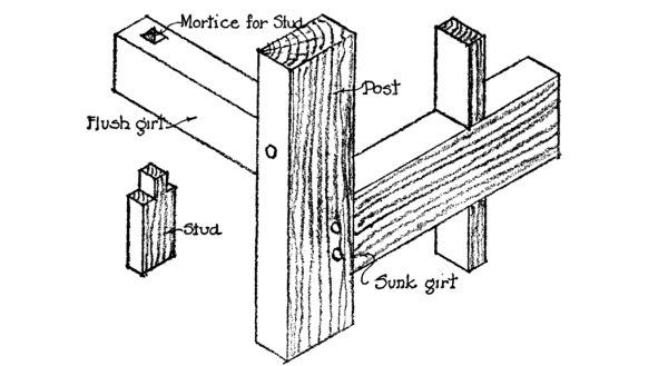 Traditions of stone mullioned windows were very strong, and these brought about a system of building wooden, unglazed sash which had mullions made of oak, set in a heavy oak frame. One of these is shown in the drawings. The word “sash” is derived from the French “chassis,” and its earliest spelling was “shas” or “shash.” In a book, “Mechanick Exercises,” written by Moxon in 1700, he mentions “shas frames and shas lights.” It was these old, unglazed wooden sash which gave birth to the modern double-hung and casement window.