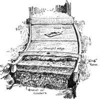 If the driveway is to be of gravel and the subsoil is wet or clayey, drainage must be arranged for along the edges. Trenches 3 feet to 4 feet deep should be dug on either side and 3-inch diameter agricultural tile laid at the bottom with open joints covered with collars, then a layer of sod, and then 6 inches of field stone or gravel, and finally top-soil. Wherever there are pockets that would collect surface water, outlets should be constructed and covered with iron grating. All the subsoil tile should connect with one main tile and drain off at some low point.