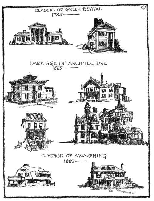 The lower we keep our house to the ground, the less will be the expense of labor, for, when work must be done above the reach of a man’s hands, it means the construction of scaffolds and the lifting by special hoists of the materials. This is not so important a consideration with the light wooden frame building as it is with the masonry house. Wherever we have brick, stone, or concrete exterior walls, for the sake of economy they should be built low. Mr. Ernest Flagg has found this to be so very true that, in houses which he is constructing at Dongan Hills on Staten Island, he has carefully limited the height of all walls to one story, and starts the construction of his roof from this level. Of course, at the gable end of the house, it is necessary to carry them up much higher. Now, the starting of the roof from the top of the first floor makes all the second floor come within the roof, and [Pg 18] this heretofore has been impracticable, on account of the great heat generated under the roof and the inability of dormer-windows to ventilate the rooms properly. Mr. Flagg has solved this problem by inventing a simple roof ventilator which is located on the ridge of the roof, and serves the purpose of both lighting and ventilating. So successful has this been, that the space which in most houses is called the attic, and is wasted, has been made available and livable. What he has accomplished by these ventilators is the ability to start the roof at the top of the first floor, and thus lower the exterior walls and set the attic in the place of the second floor and make it very livable. Not only does this principle of design save considerable money, but it follows one of those great laws of beauty, so prevalent in nature. It makes the house low and nestling in the landscape, thereby harmonizing it with the surroundings. The house of the uncultured speculator stares blatantly at you and is proud of its complete isolation and difference from the landscape; but the house of those who have taste is modestly in harmony with the surroundings. The ugly house thrusts into the air without close connection with the ground, while the comely one cuddles in nature’s lap. Is it not strange that this principle of economy is a law of beauty?