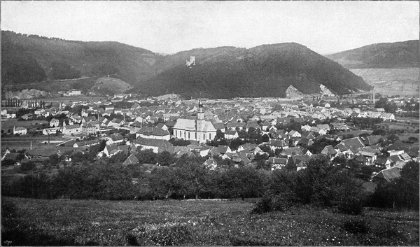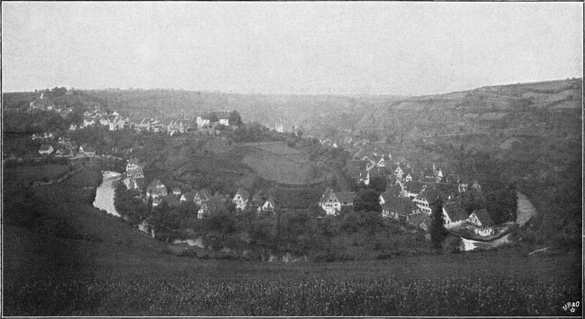 Zavelstein (Abb. 167) liegt 587 m hoch, also ganz ansehnlich über der Talsohle, über die es ebenso wie über das weite Land ringsum einen schönen Blick gewährt, besonders von der nahen Burgruine aus. Zavelstein ist die kleinste Stadt Württembergs, überragt aber mit seinen annähernd 300 Einwohnern[S. 156] seine badische Schwester Hauenstein an Größe doch noch ansehnlich. Die vom Dichter verewigte Krokus-Wiese übt ihren Farbenzauber natürlich nur in den allerersten Frühlingstagen, aber auch zu anderen Zeiten lohnt sich der Besuch des kleinen Bergnestes, von welchem aus Pfade nach allen Seiten führen. So kann man auch unmittelbar nach Calw absteigen, wenn man nicht zur Bahn zurückgehen und mit ihr nordwärts weiterfahren will.