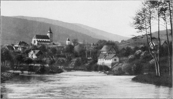 Die Nagold, die auf den Höhen östlich von Schönmünzach unfern des Murgtales entspringt, ändert bei dem nach ihr genannten Städtchen ihre bisher über[S. 153]wiegend östliche Laufrichtung, biegt scharf nach Norden um und behält diese Richtung bei bis zu ihrer Vereinigung mit der Enz bei Pforzheim. Ihr Tal ist seinem landschaftlichen Charakter nach ein typisches Buntsandsteintal, wie wir sie z. B. in großer Zahl im Odenwald antreffen. Die Talsohle ist im allgemeinen schmal, der Fluß beschreibt in ihr ähnlich dem Neckar oberhalb Heidelberg oder der Tauber in ihrem Unterlauf zahlreiche Serpentinen; die zwischen ihnen spornartig gelegenen Berghalbinseln müssen von der Bahn in nicht wenig Tunnels durchschnitten werden. Trotz der überall gleichen Grundelemente der Landschaft:[S. 154] freundliche Wiesenau in der Niederung und ernster Hochwald an den Talflanken und auf den Höhen, wechseln die Einzelbilder doch in lebhafter und anmutiger Weise, so daß die Fahrt das Tal hinab bis zur Porta Hercyniae eine höchst lohnende ist.