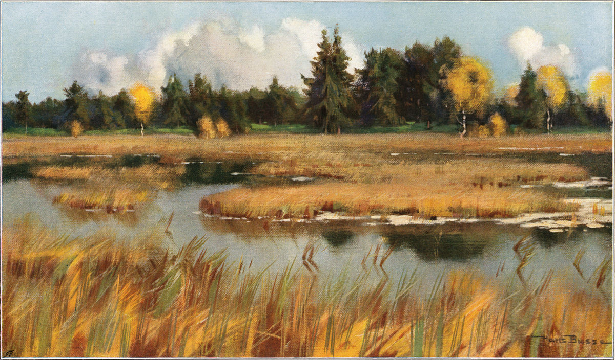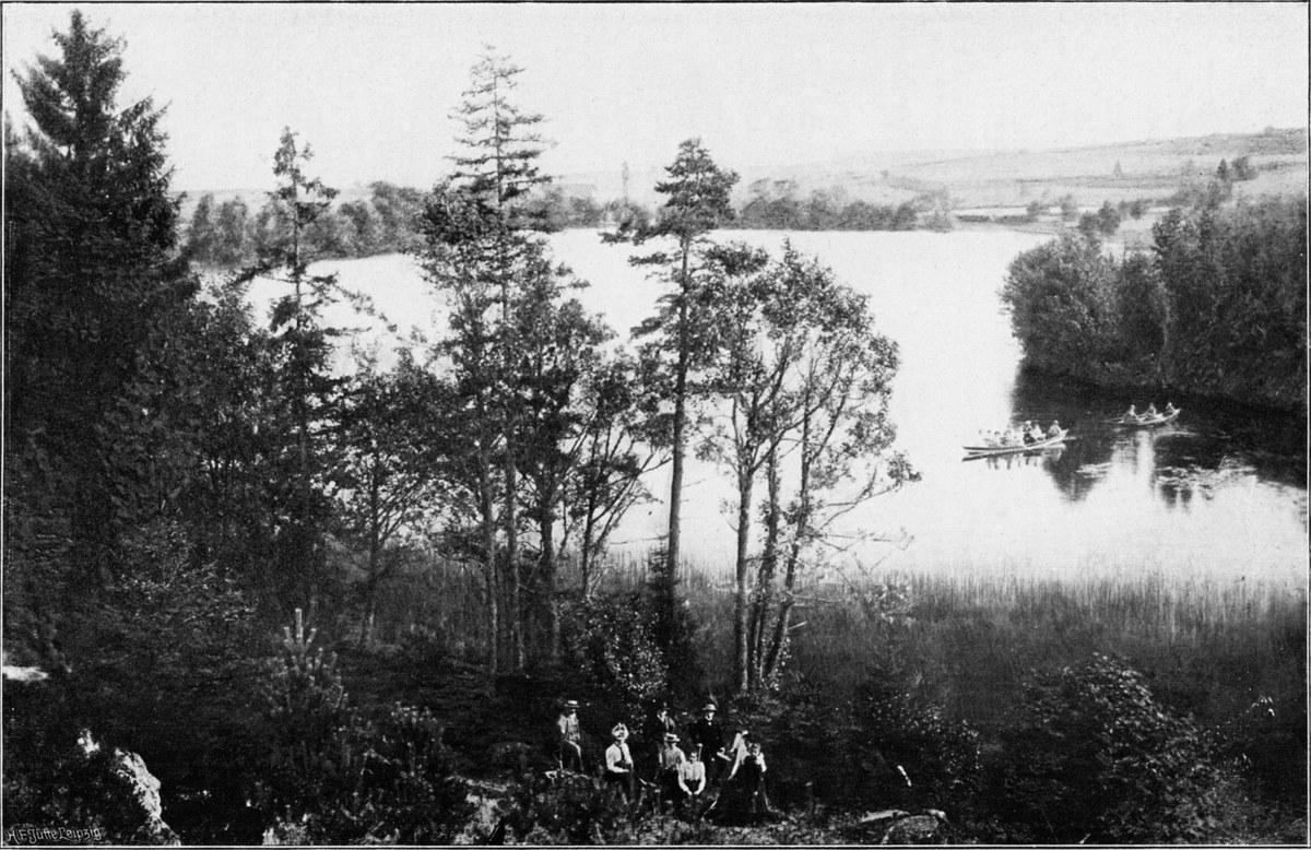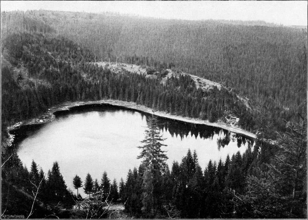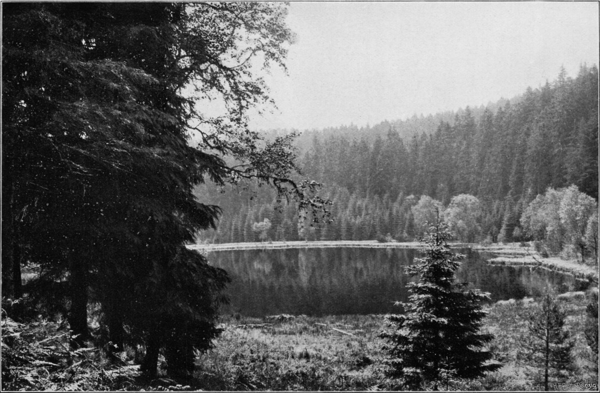 Wenn schon oben beim Mahlberg von einem Meer von Wald gesprochen werden konnte, so trifft diese Ausdrucksweise hier in noch viel höherem Grade zu. Wald und[S. 164] nur Wald, soweit das Auge schweift. Meilenweit dehnt sich der Forst nach allen Seiten aus, und nur ganz selten ist er auf kleiner Fläche unterbrochen, wo ein Forsthaus, eine Sägemühle am Bach oder ein kleines Dorf in der Talweitung unten Raum gefunden hat. Die beinahe ganz flache Hochebene ist weitum sumpfig und ausgezeichnet durch die interessante Flora der Hochmoore. Die Latsche hat hier ansehnliche Verbreitung. Der kleine, melancholische Hohlohsee und der ebenso beschaffene Wild- oder Hornsee (Abb. 171), ist nichts als eine etwas tiefere Moorwasser-Ansammlung. In dem nicht weit vom Turm abliegenden großherzoglich badischen Jagdschlößchen Kaltenbronn hat Kaiser Wilhelm II. schon wiederholt geweilt, um von hier aus der Auerhahnjagd obzuliegen.