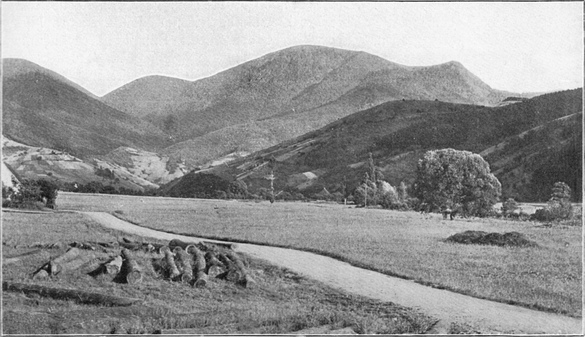 Der Kniebis ist ein 8 km langer, rund 950 m hoher, wallförmiger Kamm; er nimmt im orographischen Aufbau des Schwarzwaldes eine ganz eigenartige Stellung ein, die nur noch ein einziges Mal ähnlich vorkommt, nämlich an der früher besprochenen, über 1000 m hohen Wasserscheide von der Kaltenherberge bis zum Turner. Während nämlich auf der über 160 km langen Strecke von Waldshut bis Durlach überall sonst im Schwarzwalde Flußläufe, die von Nord nach Süd oder von Süd nach Nord laufen, die so wichtige Ostwestverbindung von Schwaben nach der Rheinebene unmöglich machen oder doch ganz wesentlich erschweren, treten am Hohlengraben wie am Kniebis, durch welche Punkte die Längsausdehnung des Schwarzwaldes in drei nicht ganz gleiche Teile geteilt wird, östliches und westliches Gefälle unmittelbar aneinander heran; daher im ersteren Falle die oft umkämpfte Straße von der Donau nach Freiburg, im zweiten die[S. 144] aus dem Herzen des Neckarlandes nach Straßburg. Auf dem Kniebis (Abb. 156) treffen sich zwei Straßen aus dem Renchtal von Oppenau und Griesbach, eine aus dem Kinzigtal von Rippoldsau, und endlich die von Freudenstadt und dem schwäbischen Hügelland her. Daß man vor zwei Menschenaltern daran dachte, Freudenstadt zur deutschen Bundesfestung zu machen, erscheint hiernach ebenso verständlich wie die Tatsache, daß wir an der Stelle, wo die Griesbacher Straße die Kammhöhe gewinnt, die nach ihrem Erbauer Alexander von Württemberg genannte Alexanderschanze (1734) finden, während die Oppenauer Straße auf dem Kamm durch die im Dreißigjährigen Kriege erbaute Schwedenschanze und durch die aus dem Jahre 1796 stammende Schwabenschanze geschützt ist.