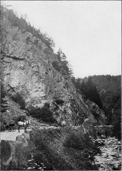 Schlagen wir von der Besenfelder Gegend aus der Enz entlang eine nördliche Richtung ein, so kommen wir bald zum Stauweiher des Poppelsees, der früher den Zwecken der Holzflößerei diente; dann lichtet sich allmählich das Tal ein wenig, in Enzklösterle (Abb. 175) zweigen Straßen zum Hohloh und nach Altensteig ab, und immer dem munteren Flüßchen folgend dringen wir allmählich in die Bannmeile von Wildbad ein, dem bedeutendsten, neuerdings lebhaft aufgeblühten Badeort des Königreichs Württemberg.