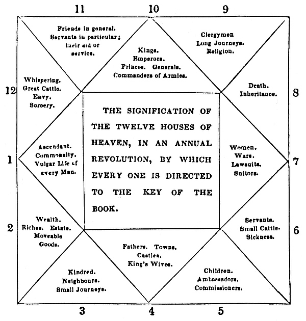 Supposed Origin of Astrology—Butler on the Transmission of Astrological Knowledge—Remarks on Astrology by Herveyxi—Petrarch’s Opinion of Astrology—Catherine of Medicis—Casting of Nativities in England—Moore’s Almanack—Writers for and against Astrology—Horoscope of Prince Frederick of Denmark—Astrologers contributed sometimes to realize their own Predictions—Caracalla 244
