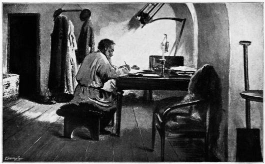 In his method of working, Tolstoy may be likened to the old painters. Having settled upon a plan of work, and collected a large number of studies, he first makes a charcoal sketch, as it were, and writes rapidly without thinking of particulars. He then has a clean copy of the work made by his wife or one of his daughters, and this is again subjected to careful remodelling. It is still in the nature of a charcoal sketch. The MS. is speedily covered with erasures and interpolations. Whole sentences replace others. The work is then copied again, and some chapters Tolstoy writes more than ten times. He usually writes on quarto sheets of cheap plain paper in a large involved hand, and sometimes covers as many as twenty pages in one day. He regards the interval between nine o’clock and three as the best time for work.
