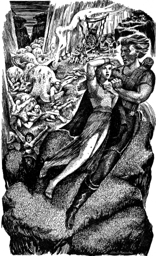 All in a few seconds, and then Atwood recovered his wits. Like an awkward plunging bird he leaped from one platform to the other, landing full upon Ah-li and the shouting Bohr. It took Bohr by surprise. Atwood's body struck him full so that he rocked, staggered a little, his grip releasing the girl as wildly he flailed his arms to ward off this huge attacking thing clinging to him. The impact against Bohr's solidity all but knocked the breath from Atwood. He found himself hanging with feet off the ground as he clung. And desperately he fought for the knife. Bohr's fingers in his confusion must have gripped it loosely; and abruptly Atwood had it, stabbed it into Bohr's face.