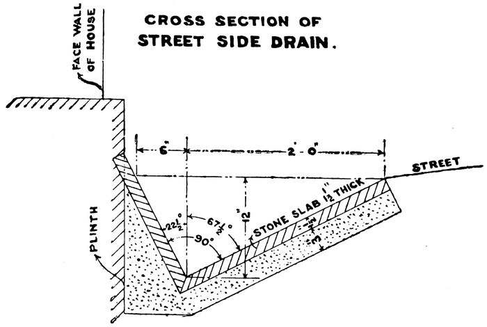 In paths or gullies a small concrete saucer drain can be constructed, at a cost not exceeding four annas a lineal foot, into which the house connections can be made,—the paths being paved with bricks, set flat, not costing more than Rs. 2–8 per 100 square feet. These should be laid at a good slope to the drain, and as only foot traffic need be provided for, is amply strong enough. In many cases it will be found that adjacent house-holders are quite willing to pay for this work, when once a commencement is made, and the advantage is obvious to them.