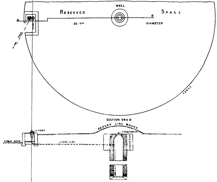 When a new well is proposed, and local conditions are suitable, a safe form is that designed by Dr. Cameron of Wigton, N. B. This arrangement is shown in Fig. 5. The well should be in the centre of a reserved area of at least 20 yards in diameter, and the lead pipe leading from it to the pump must be fitted by brass screw joinings. This is a suitable design for the vicinity of cutcherries, where an open space for a reserved area is generally available.