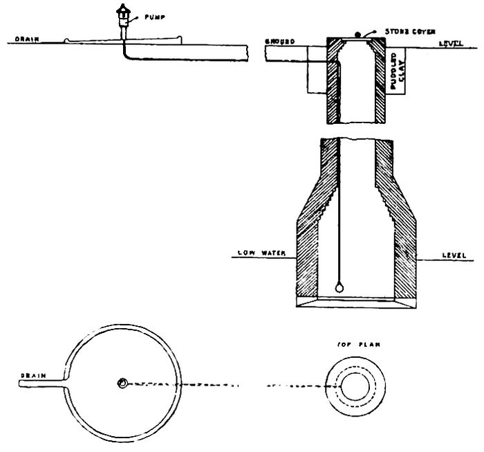 10Another excellent design for a new well, and one more generally suitable, is shown in Fig. 6. This prevents any danger of the water being contaminated by dirty vessels being lowered into it for the purpose of drawing water.