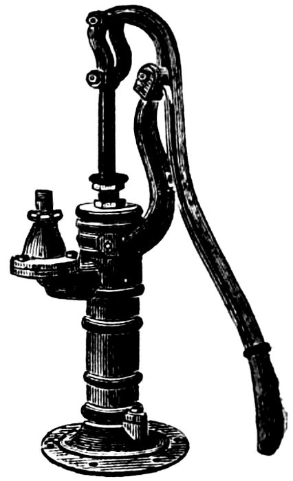 Tube wells answer admirably in many localities; it is, however, always essential to have a bore hole made first to determine the stratum which has to be tapped, as the point of the tube may be easily driven through this. An improved form of pump is shown in Fig. 7; this obviates the danger of impure water being put in the mouth of the pitcher spout pump in order to make it draw.