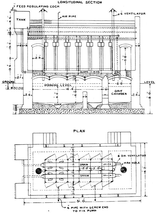 3When designing a drainage system for a town it is essential that provision for flushing be made at the same time, otherwise the drains become receptacles for filth for about two-thirds of the year. This can be arranged by the construction of flushing tanks, which, when full automatically discharge into the drains, by water mains laid underground discharging into the head or summits of the drains; and also by the drains being divided up into convenient sections by stops or sluices, which are lifted automatically, or by manual labour, when the section is full of water, thus ensuring an effective flush.