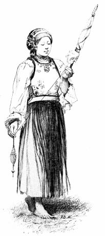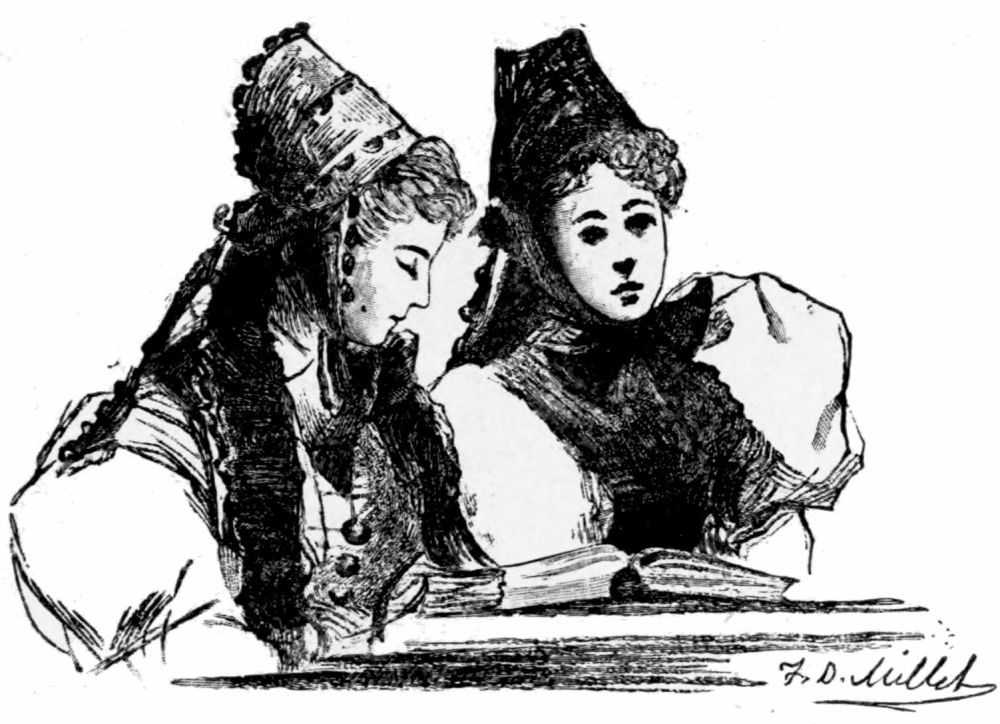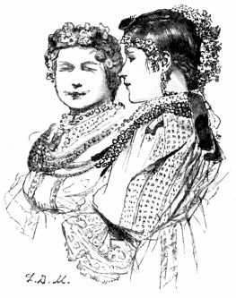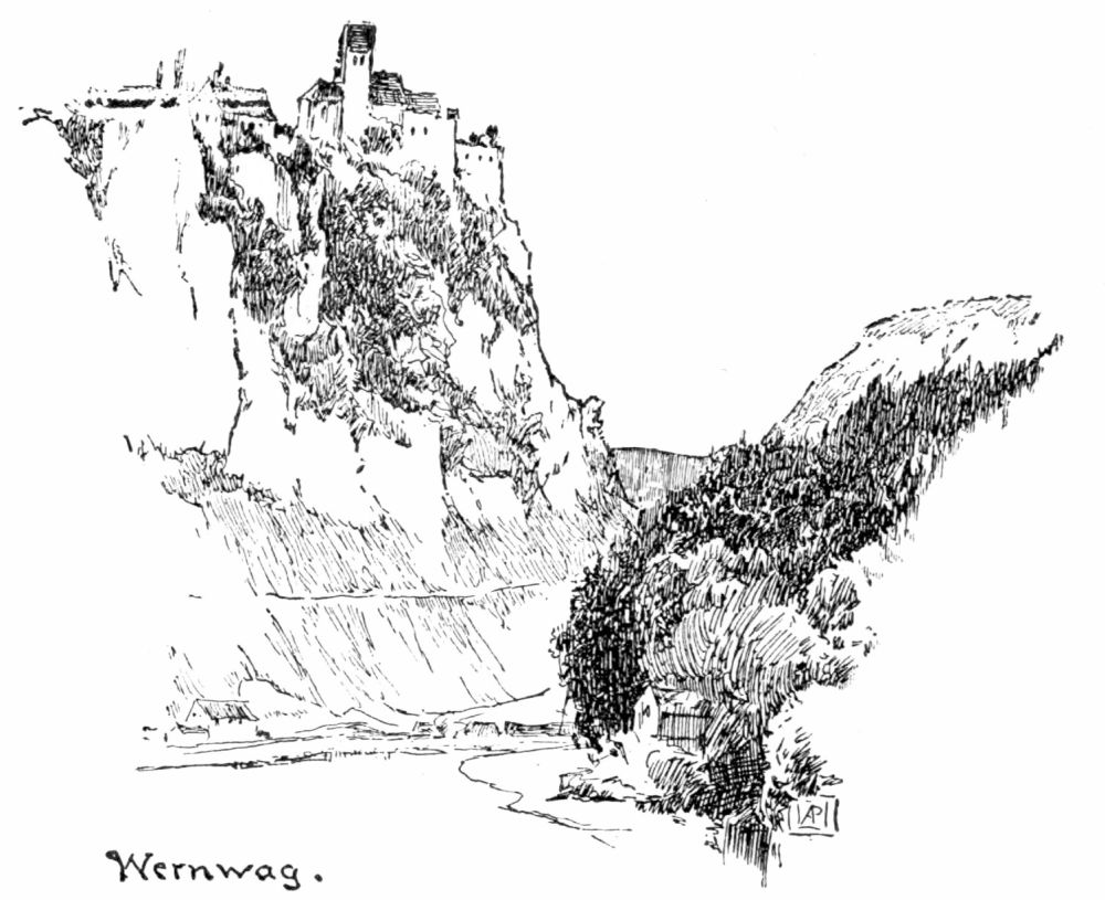 The quaintest and strangest of costumes met our eyes as we leaned out of the window of our compartment when the train stopped at the station of St. Georgen, eager to see how the brook had widened there. The hurrying peasant women, in queer skull-caps with immense ribbon bows, stiff bodices, and short petticoats, seemed to be the supernumeraries in the prologue of an exciting, drama now about to begin. The train rolled slowly on with that peculiar settling-down motion that denotes a descending grade, and we watched the yard-wide brook gradually expand its channel and assume the proportions of a goodly stream. In the fertile valley near Villingen, where the country opens out{5}